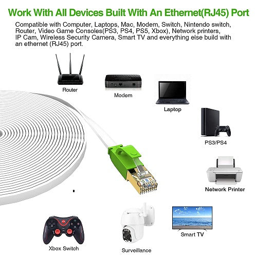 【Broad Compatibility】Fast ethernet cable is compatible with Cat7/Cat5/Cat5e/Cat6/Cat6e. Support Power over Ethernet (PoE) technology for delivering power and data over a single cable,can reach PoE devices like cameras and wireless access points. Work perfectly for network switch/gigabit switch, Nintendo switch, IP Cam, gaming (PS3, PS4, PS5, Xbox), hub, router, modem, laptop, printer, NAS, VoIP phones, ethernet adapter, smart TV and other devices with rj45 connectors.