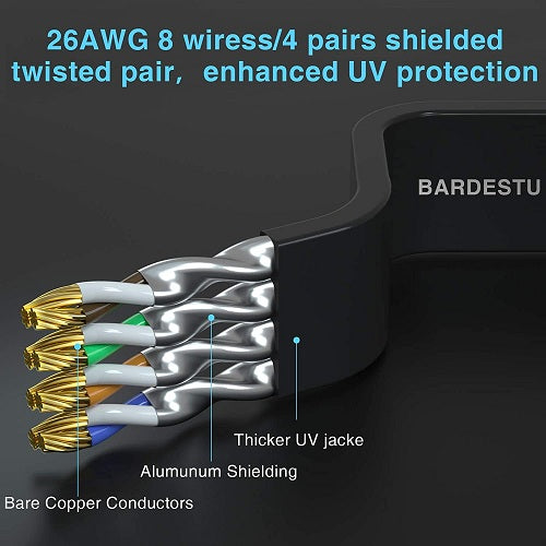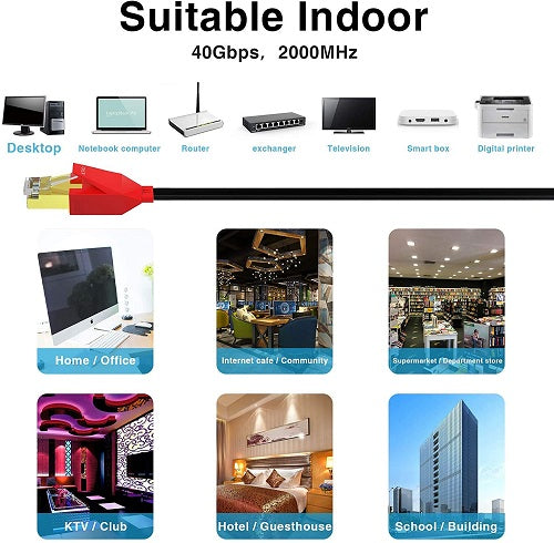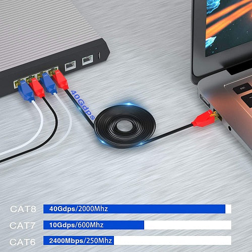 Category 8 Ethernet cable is a new category of cabling that it has a greater throughput capability, it can support transmission of data up to 40Gbps over balanced twisted pair copper cable. Cat8 internet cable SLIM AND FLAT, it can space Efficient - Network flat cables slide under the carpet without raising it or showing that it is under there. Smooth existence also brings about consistent electrical characteristics.