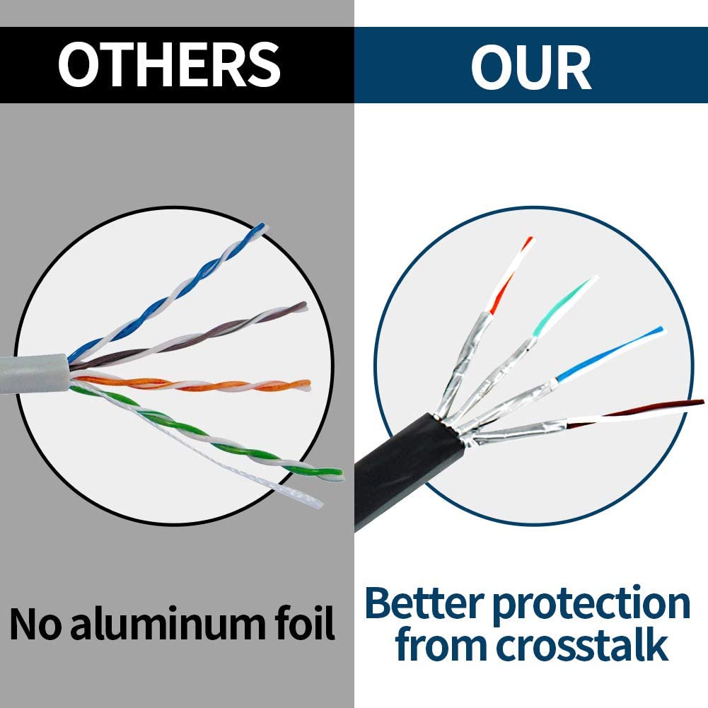 - Each of the four twisted pair sets are shielded by foil, and the patch cable is terminated with two shielded copper plated RJ45 connectors. Multi-protection mechanism significantly improves noise resistance and interference elimination